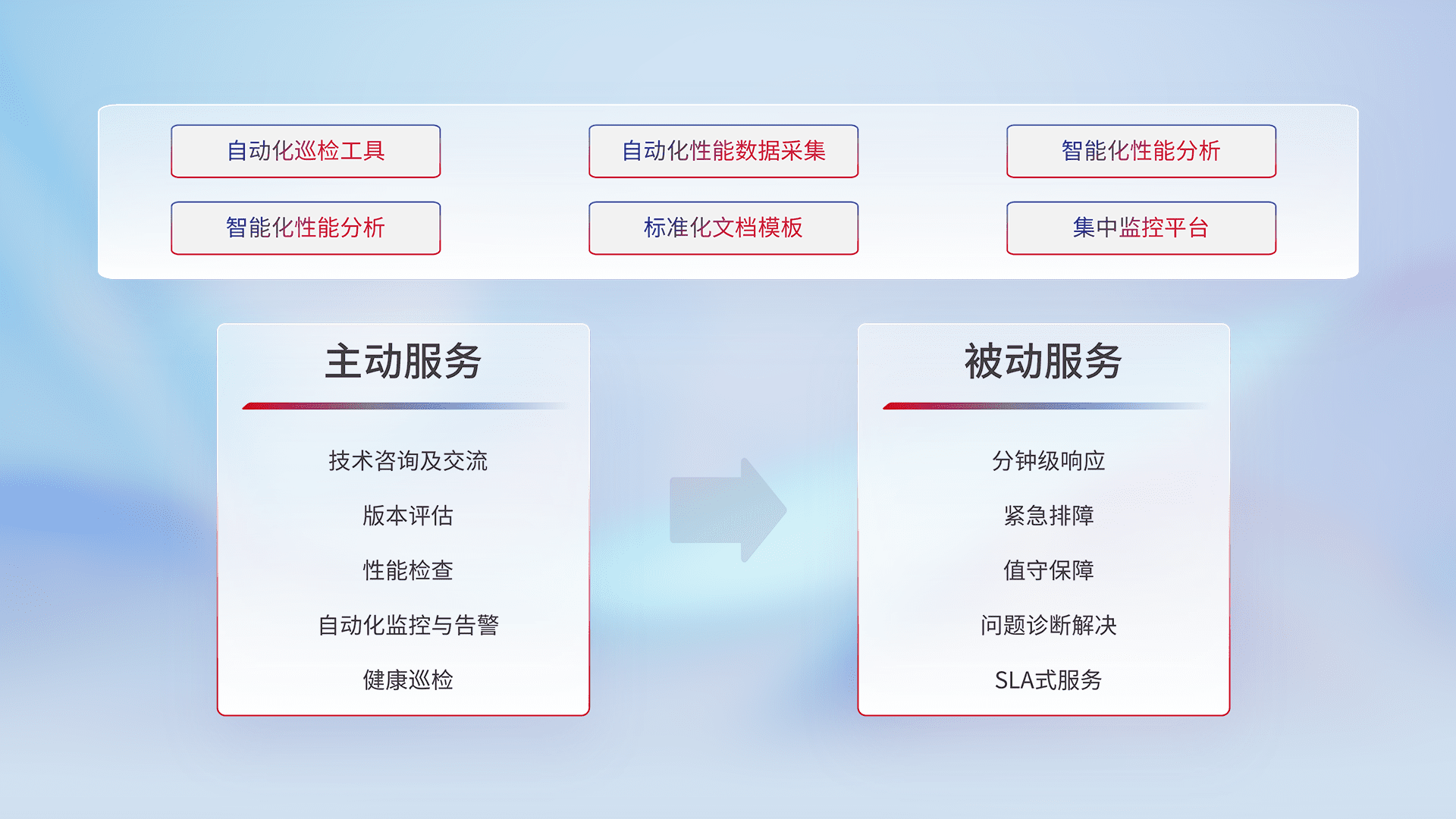 智能化工具和标准化文档,,,保障服务质量,,,,提供主动服务(包含技术咨询、、版本评估、、性能检查、、自动化监控与告警、、、健康巡检)和被动服务包含(分钟级响应、、紧急排障、、值守保障、、、、问题诊断解决、、、SLA服务)。。。。