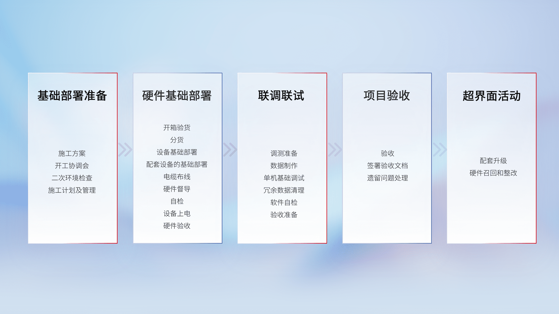 从基础部署准备、、、硬件基础部署、、、、联调联试、、、项目验收、、、越界面活动的全过程可追溯,,,保证施工质量和进度。。。。